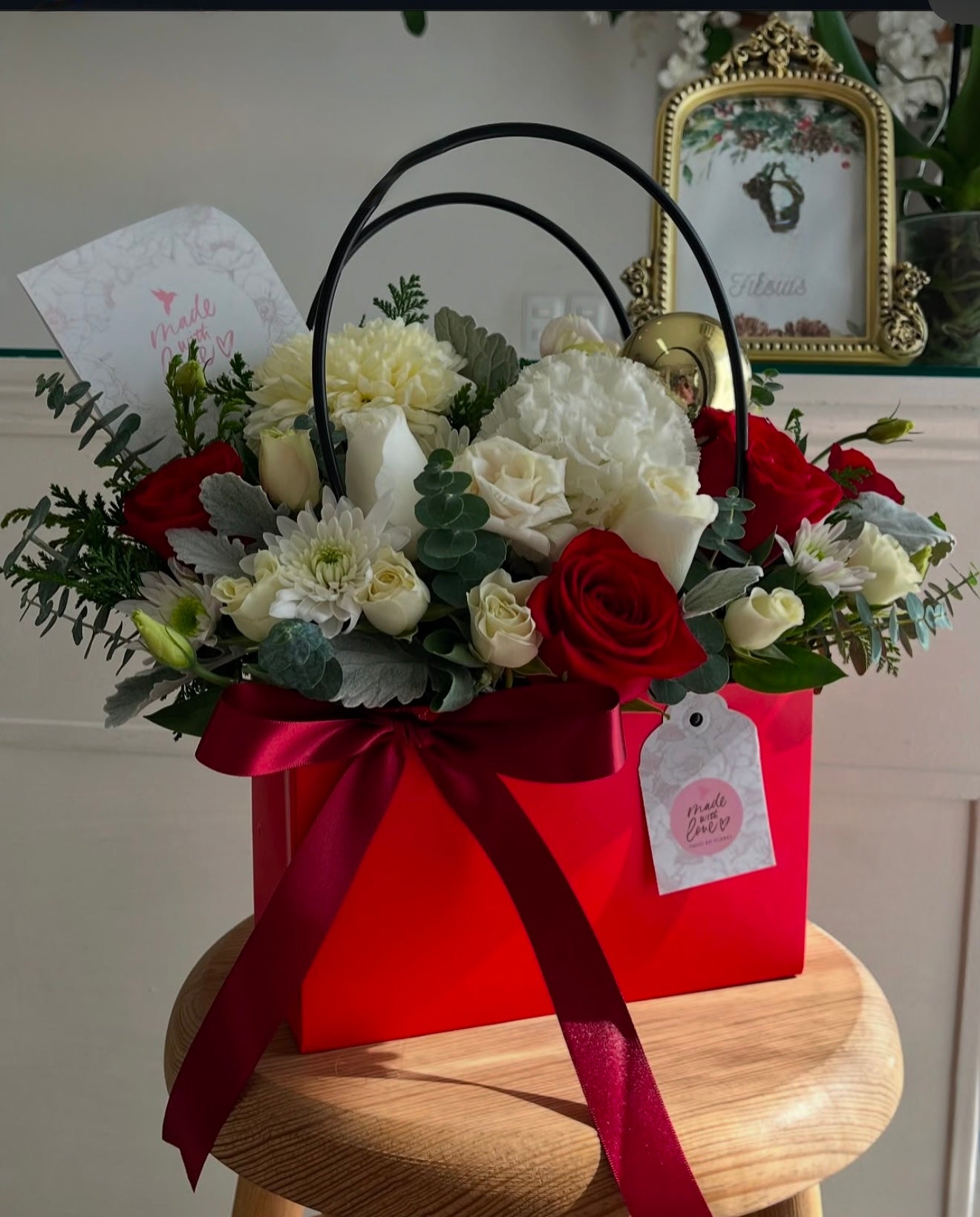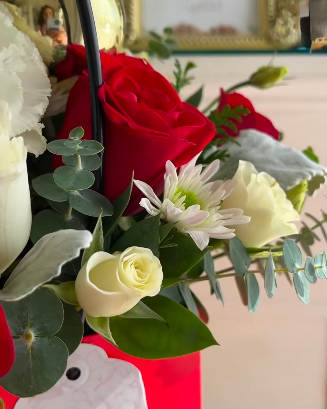 Handcrafted arrangement featuring vibrant red roses, white carnations, creamy spray roses, chrysanthemums, eucalyptus, and dusty miller. Presented in a stylish box and tied with a satin ribbon, it’s perfect for celebrating love and special moments.